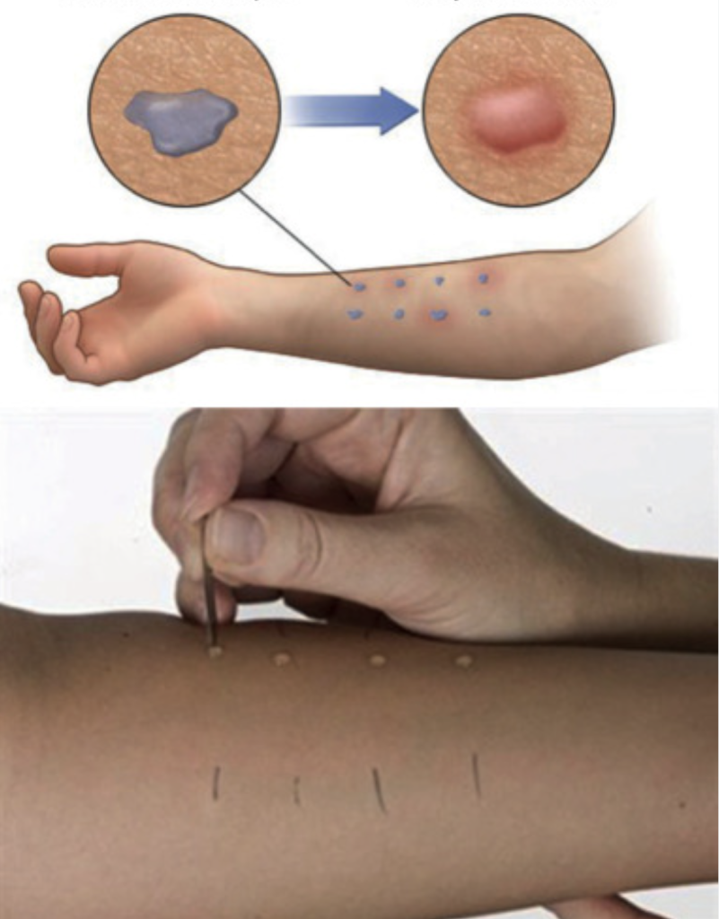 Se realiza en el antebrazo o el dorso, donde se inyecta una pequeña cantidad del alérgeno con una aguja fina dentro de la piel. Se lee a los 20 minutos.